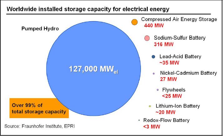 L’EPRI rappelle que dans le monde, le pompage hydraulique avec 127 GWe de puissance installée représente 99% du total des stockages (FIG.I). Il compte pour 40 GWe aux États-Unis et l’installation de 4GWe de puissance supplémentaire est en cours. Le pour-cent restant des systèmes de secours est assuré par deux unités de stockage d’air comprimé (0,44GW) et par des batteries, essentiellement au Sodium-Soufre, et quelques volants à inertie.
