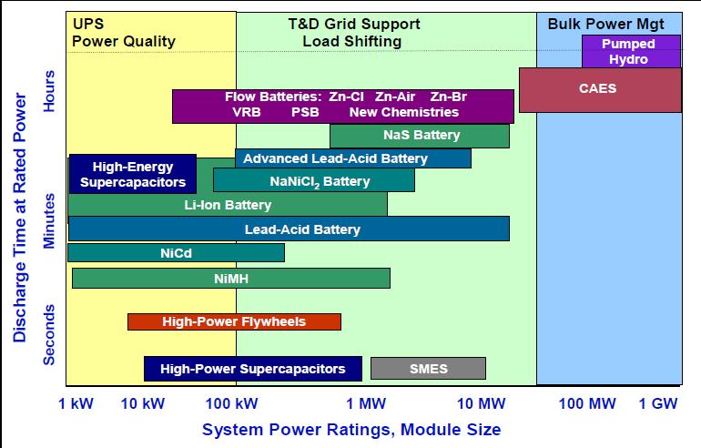 -A l’autre extrême des puissances de quelques dizaines de kW durant quelques secondes pour assurer la qualité du réseau devraient être assurées par les volants à inertie (Flywheels) ou des batteries de supercapacités.