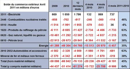 Vingt six milliards d’euros, soit dix milliards de plus pour l’ardoise du commerce extérieur de la France pour les quatre premiers mois 2011 par rapport à celle de la même période de l’année précédente (TAB.). Et pendant ce temps là nos élus ratiocinent sur l’imposition des œuvres d’art ou sur la dangerosité des gaz de schistes. Un Muppets-Show national… en vrai. La facture énergétique avec un solde négatif de 21 milliards d’euros creuse le gros du trou, les importations d’automobiles toujours plus belles, de minerai de fer et de métaux non-ferreux toujours plus chers participent au massacre.