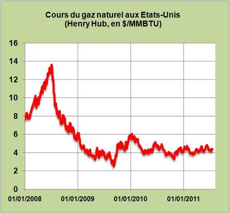 En raison de cours du gaz naturel actuellement très bas aux États-Unis (FIG.) entre 4 et 5$ le MMBTU alors qu’ils sont 2,5 fois plus élevés en Europe, ces opérations ne semblent pas aujourd’hui dégager de larges profits. Cependant, il ne faut d’une part pas négliger la ressource financière que constituent les liquides associés à ces gaz et il est opportun d’autre part de prendre en compte sur le moyen-terme l’inexorable montée des cours de l’énergie. Rien n’affirme que les cours du gaz naturel US vont continuer à se traîner sous les 5 dollars le MMBTU alors que les cours du pétrole vont se valoriser.