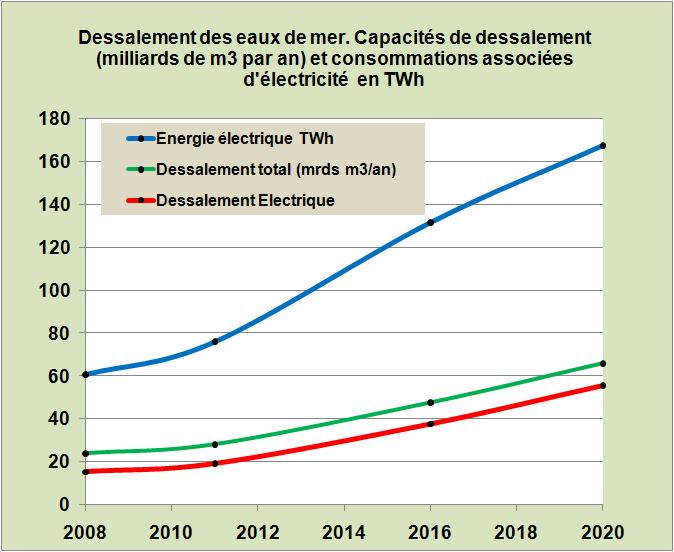 il apparaît que la consommation d’électricité dans le dessalement va poursuivre sa croissance et passer d’une consommation annuelle autour des 60 TWh en 2008 à une énergie autour des 170 TWh en 2020 (FIG.). Par la suite chaque milliard de m3 d’eau consommée de plus, demandera dans les deux TWh d’électricité pour le produire. Il faut ramener ces consommations aux trente mille TWh d’électricité qui seront environ produits annuellement en 2020 dans le monde.