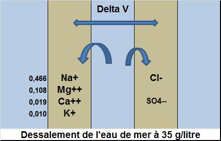 Pour enlever par électrodialyse les sels contenus dans une eau de mer à 35 grammes de sels par litre il faut faire passer avec un rendement supposé de 100% et en tenant compte des concentrations et des charges des divers ions une quantité d’électricité autour de 0,6 Faraday soient 16,1 Ah. Pour estimer l’énergie nécessaire à cette opération de désolvatation des ions et de transfert au travers de membranes il faut connaître la tension Delta V, pour une densité de courant donnée, entre les deux compartiments riches en sel encadrant une des paires de membranes d’un réacteur. Pour un Delta V autour des 100 mV l’énergie de désolvatation et de transfert des ions est de 16,1 x 0.10 = 1,6 Wh par litre. Il faudra pour le bilan complet tenir compte la tension d’électrolyse aux deux extrémités du réacteur ramené au nombre N de paires de membranes. Par exemple pour n=50 et une tension totale de 7 Volts la tension moyenne par cellule est de 7/50 = 140 mV. Dans ce cas pour un rendement supposé à 100% l’énergie nécessaire sera de 16,1 x 0.14 = 2,3 Wh/litre. On le voit, la qualité des membranes et la pureté de l’eau floculée et ultra-filtrée permettant d’éviter le « fouling » des membranes entrant dans la cellule sont les points clés d’une électrodialyse économe en énergie.