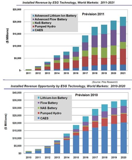 La prévision 2010 (graphique du bas) prévoyait une immense et inattendue progression du stockage par compression d’air (CAES) c’était apparemment une bêtise puisqu’elle passe de plus de 20 milliards de dollars en 2010 à quelque chose autour des deux milliards en 2011. L’autre grand changement provient du rôle des batteries Sodium-Soufre qui était complètement sous-estimé en 2010 et qui apparaît fort logiquement de façon significative en 2011. L’ensemble du business affirme Pike devrait dépasser les 22 milliards de dollars alors qu’il annonçait 35 milliards un an plus tôt.