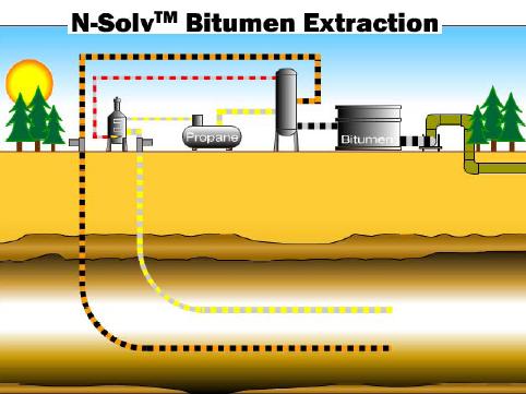 Les procédés d’extraction des bitumes canadiens par solvants se sont avérés jusque là inefficaces à l’exception, peut-être, du procédé N-Solv de John Nenninger qui a breveté en 1998 l’utilisation d’injections de Propane chaud (vers les 50°C) qui permet de faire descendre la viscosité du mélange propane-bitume vers une fraction de centipoise et de rendre extractible une large part de la ressource, les deux-tiers environ, à l’exception des asphaltènes insolubles.