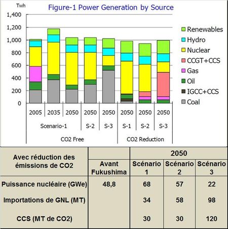 L’Institute of Energy Economics japonais (IEEJ) publie une étude portant sur divers scénarios d’évolution du mix énergétique de production des 1000 TWh d’énergie électrique nécessaires à son pays. Il a sélectionné trois hypothèses: