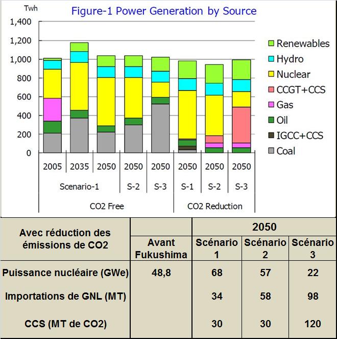 L’Institute of Energy Economics japonais (IEEJ) publie une étude portant sur divers scénarios d’évolution du mix énergétique de production des 1000 TWh d’énergie électrique nécessaires à son pays. Il a sélectionné trois hypothèses: