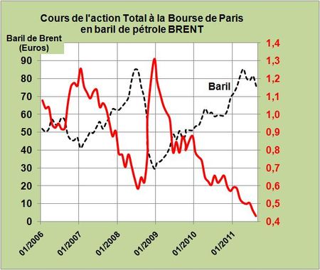 Les dégâts boursiers sur ce champion national sont considérables. Le cours de son action qui valait autour d’un baril de pétrole de Brent dans les années 2006-2007 (entre 50 et 60 euros) ne vaut plus à 32 euros en 2011 que 0,4 baril de brut (FIG., courbe rouge, échelle de droite). Perte de capital qu’aucun actionnaire ne peut avaler sans demander un plan de redressement de l’Entreprise.