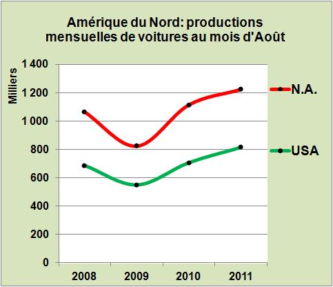 Les productions globales nord-américaines ont dépassé 1,2 million d’exemplaires au mois d’Août dont les deux-tiers aux USA (FIG.). Cette progression de 9,8% sur le mois par rapport à il y a un an et de 8,6% en cumulé depuis le début de l’année permet d’anticiper une bonne croissance des productions de voitures en Amérique du Nord en 2011 malgré les perturbations d’approvisionnements de composants japonais. Ces bons chiffres de progression devraient se retrouver dans les statistiques du PIB américain du troisième trimestre.