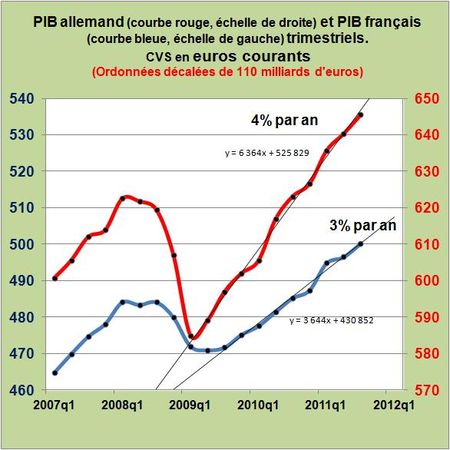 Ces courbes permettent d’éviter de se plonger inutilement dans les pinaillages de croissance d’un trimestre à l’autre, tant appréciés de nos Gazettes et qui s’avèrent être largement erronés après correction des valeurs publiées au trimestre suivant. En Euros courants ces données sur plusieurs trimestres peuvent être directement comparées aux évolutions des dépenses, des recettes ou des dettes des États. Par exemple la dette de la France à 1693 milliards d’euros à mi-année 2011 avait pris 101 milliards de plus en un an, soit 6,3% …ceci est tout simplement incompatible avec la croissance de 3% du PIB. Elle aurait dû être au moins contenue à la moitié, ce qui aurait supposé une diminution des dépenses annuelles de l’État Providence d’au moins 50 milliards. Les montants annoncés pour l’instant par nos timorés dirigeants ne sont pas à la hauteur de l’enjeu. Attendons-nous donc à une prochaine phase de Socialisme gestionnaire impitoyable, seul capable de vraiment réformer notre trop complexe pays!