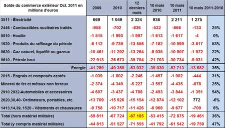 Il y a un an les dockers du port de Marseille avaient ralenti les importations de pétrole. Cette année ils ont exceptionnellement travaillé au mois d’Octobre, alors le trou se creuse (-35,7 milliards) auquel il faut rajouter le déficit croissant en produits raffinés (-13,6 milliards).