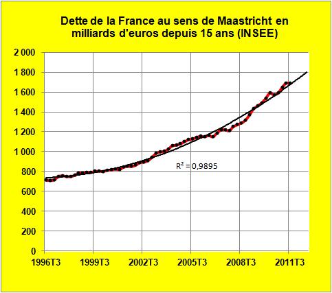 -la dette publique au sens de Maastricht à 1689 milliards d’euros s’est accrue de 114 milliards en un an (+7,2%) dont 24 milliards imputables à la sécurité sociale,