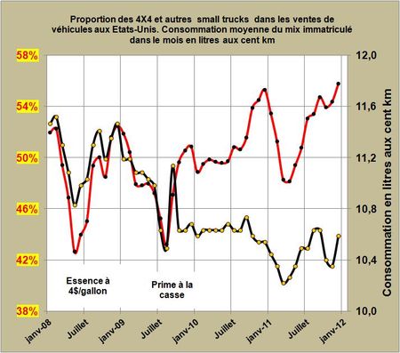 La consommation nominale de carburants des modèles commercialisés dont dépend pour une large part la consommation de produits pétroliers de ce grand pays, enregistre malgré cette vogue des véhicules « statutaires » une lente décroissance (courbe noire, échelle de droite). Au mois de Décembre elle affichait une valeur de 10,6 litres aux cent km (235/22,2 miles/gallon).