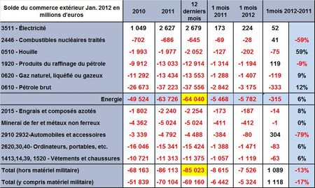 La facture énergétique du mois de Janvier ressort à 5,8 milliards d’euros (TAB.) en augmentation de 6% par rapport à celle enregistrée un an auparavant malgré une amélioration du solde des échanges d’électricité avec nos voisins et une moindre dépendance en produits raffinés, séquelle des grèves des raffineries françaises en Novembre 2010. En cumulé sur les douze derniers mois la note énergétique s’élève à 64 milliards pour un déficit global, hors matériel militaire, de 85 milliards annoncé par les Douanes.