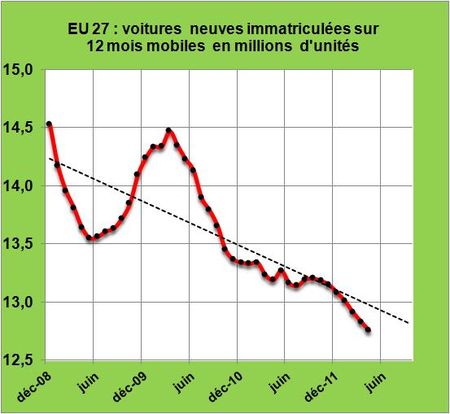 En ce début 2012 ce sont les Français déprimés par les propos électoraux débiles qui leur annoncent un futur nouvel impôt « purificateur » par jour, qui entraînent la musique. Sur Janvier-Février cumulées les livraisons de véhicules neufs se sont effondrées de 20% en France pour une chute de 8% en Europe.