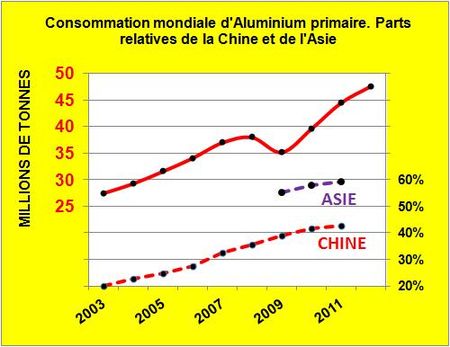 Sur la base de 15,7 kWh d’électricité par kg d’aluminium, ces productions correspondent à des consommations d’électricité de 750 TWh auxquelles il faut ajouter autour des 15% pour tenir compte de la production de la soude utilisée en amont du procédé dans la purification de l’alumine. Cette industrie consomme globalement dans les 4% de l’électricité produite dans le monde.