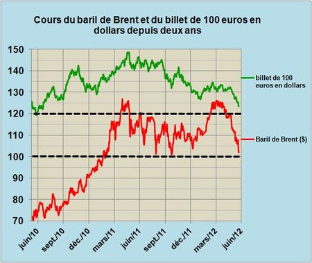 En ces temps de relative clémence du climat politique au Proche et Moyen-Orient nécessaire à la réélection du Président Obama, en ces temps de bonne tenue du change du dollar contre les autres monnaies dont celui de l’euro (FIG.) défaillant, il n’apparaît pas opportun de se couvrir en achetant du pétrole papier, les bonds de la FED en dollars sont plus sûrs. Cela suffit pour voir les cours du BRENT rejoindre la limite basse du domaine de fluctuation des cours établi depuis 16 mois à 110 + ou – 10 dollars le baril. Ce qui étonne les commentateurs béotiens dans cette baisse des cours est sa célérité. Mais le niveau atteint vers les 100 dollars le baril, prix optimal pour les saoudiens, est encore 33% au-dessus des prix de 75$ le baril atteints il y a deux ans pour un cours de l’euro en dollars identique à celui d’aujourd’hui (FIG.). Le pétrole est durablement cher, malgré la faiblesse supposée de l’économie chinoise et de celle plus certaine de l’économie européenne. La déplétion des champs en activité estimée aux environs de 4% par an (3 millions de barils/jour) agissant négativement sur l’offre et gommant les fluctuations conjoncturelles à la baisse de la demande, suffit à entretenir les nécessaires investissements indispensables au maintien d’un volume global d’extraction de brut autour des 76 millions de barils/jour. Ces investissements de plus en plus complexes et parfois périlleux nécessitent un baril à plus de 100 dollars pour être rentabilisés par les Groupes pétroliers.