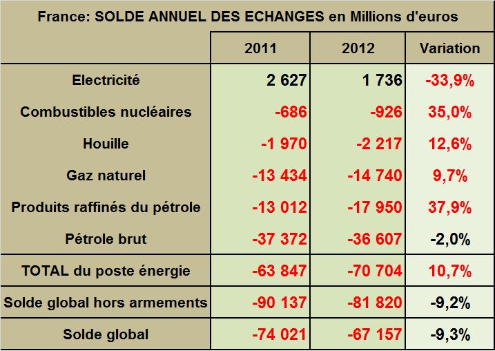 La France et son économie sont durablement handicapées par la facture énergétique. Les données 2012, publiées par les Douanes, confirment encore le poids croissant de ce lourd fardeaux financier qui plombe l’économie de notre pays. Plus de 70 milliards d’euros de solde négatif pour le seul poste énergie en 2012, en croissance de 10,7% par rapport à celui de l’année précédente (TAB.). Bien sûr une part de ces devises gaspillées reviendra dans l’économie française sous forme d’achats d’armements ou de produits et services de luxe…mais une faible part seulement.
