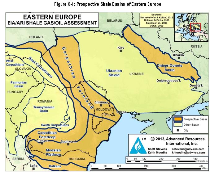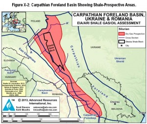En accord avec sa volonté de désengagement vis-à-vis de ses approvisionnements en gaz russe, sources d’incessantes querelles, l’Ukraine poursuit sa politique de prospection et de mise en exploitation éventuelle de ses réserves de gaz de schistes. Après avoir signé au mois de Janvier dernier avec Shell un accord de prospection et l’exploitation de ses champs du bassin de Dniepr-Donetz, situé à l’Est du pays, les dirigeants ukrainiens viennent de signer un accord semblable avec l’américain Chevron pour explorer et mettre en exploitation  le champ  d’Olesska situé au coeur du Bassin promontoire des Carpates, à l’Ouest de l’Ukraine (FIG.).