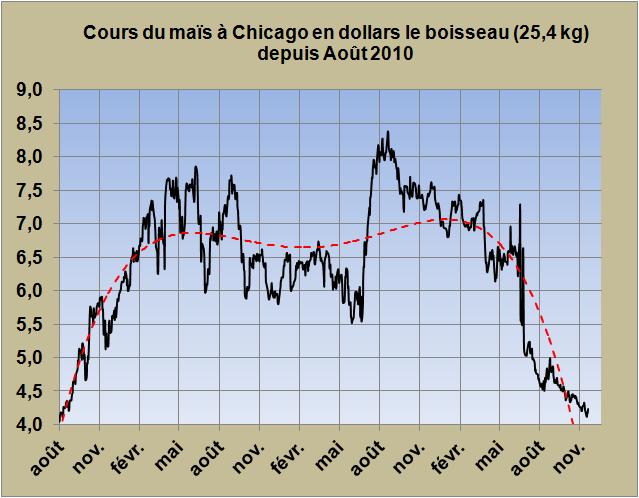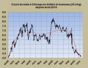 Souvenez-vous, braves-gens! Lors du printemps 2011 les cours du maïs en grains à Chicago avaient atteint les 7,5 dollars le boisseau (FIG.), ceci représentait, dans les conditions normalisées de siccité des grains, un prix autour des trente cents US le kilogramme (scandale écologique!). De doctes économistes, issus pour la plupart des rangs de l’altermondialisme, nous avaient alors expliqué qu’à ces prix là, les pauvres mexicains n’allaient plus pouvoir acheter leurs tortillas et que tout cela était la faute des biocarburants qu’il fallait bannir.