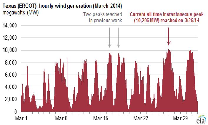 Allez, pour vous montrer que le problème de la variabilité des ENR intermittentes est un problème qui transcende les frontières et les Océans: voici le profil des générations d’électricité éolienne au Texas durant le mois de Mars 2014 publiée par l’EIA américaine, de quasi zéro à plus de 10 GW en puissance.