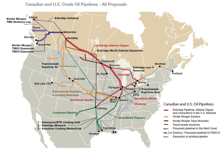 Enfin, cerise sur le gâteau, l’enclavement de l’Athabasca, rend hypothétique l’évacuation vers les côtes américaines les bitumes extraits. Trois voies sont possibles (CARTE), celle vers le Sud qui rencontre l’opposition de l’Administration américaine au projet Keystone XL, celle vers l’Ouest qui ouvrirait la route vers l’Asie et la Californie à partir des rives canadiennes du Pacifique. A ces deux hypothèses se rajoute une nouvelle route vers l’Est qui permettrait de rendre ces bitumes accessibles au Golfe du Mexique et aux ports européens à partir des rives du Nouveau Brunswick canadien.
