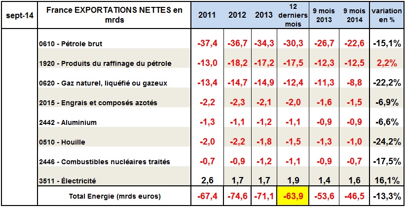 Compte tenu de la baisse très rapide des cours du pétrole enregistrée durant le mois d’Octobre et ce début du mois de Novembre, il me semble raisonnable de pronostiquer qu’en 2014 le solde du déficit énergétique de la France sera réduit de 10 milliards d’euros au-moins par rapport à celui de 2013.