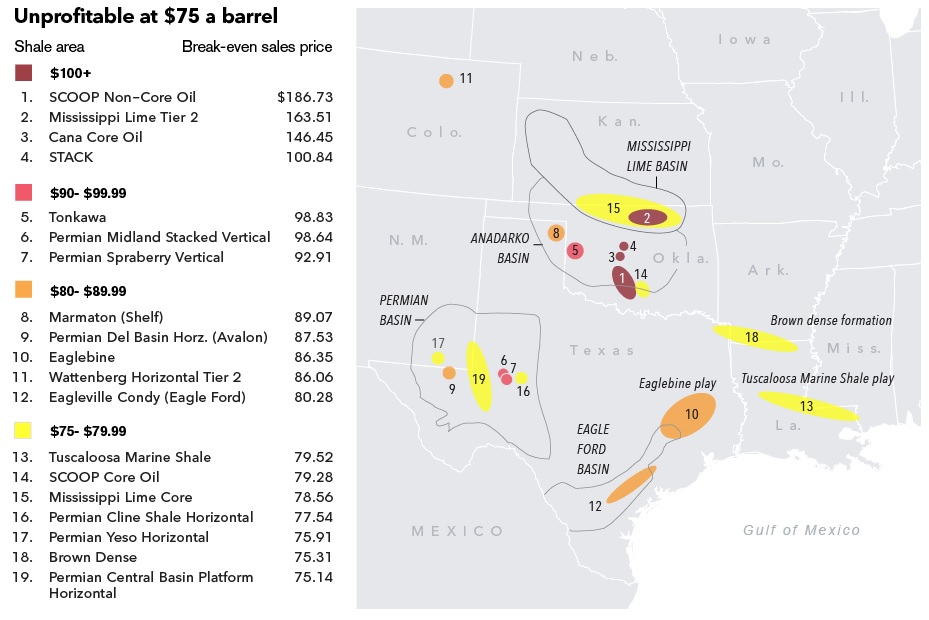 La baisse massive de l’ordre d’un tiers des cours du pétrole aux États-Unis résultant de cette position radicale des Saoudiens sur le marché, incite les analystes de marché à poser la question du seuil de rentabilité (break-even) des extractions de gaz et huiles de schistes en fonction des cours du pétrole.