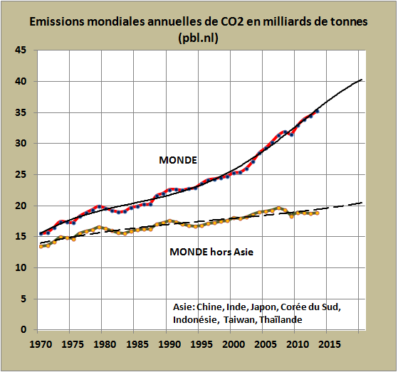 Il est possible de distinguer parmi ces publications les émissions des grands pays asiatiques (Chine, Inde, Japon, Corée du Sud, Indonésie, Taïwan, Thaïlande) de celles des autres pays, essentiellement non asiatiques. (FIG. courbe « Monde hors Asie « ). Alors que les émissions de CO2 du Monde hors Asie se sont stabilisées au-dessous des 19 milliards de tonnes de CO2 depuis cinq ans (2009 à 2013), les émissions des grands pays asiatiques poursuivent leur progression. Elles représentaient 15% des émissions globales dans les années 70, puis 30% au tout début des années 2000, 47% en 2013 et représenteront la moitié des émissions mondiales en 2020.