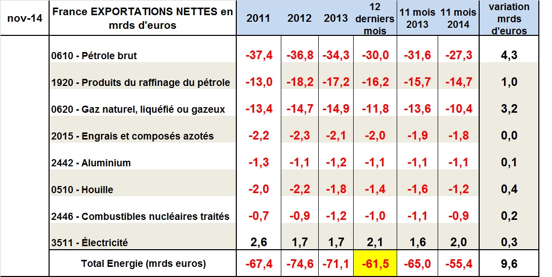 A fin Novembre, nous informent les Douanes, la facture énergétique de la France a baissé en onze mois de près de 10 milliards d’euros (TAB.). Cette baisse est imputable pour près de 90% à la baisse en euros des importations nettes de pétrole, de produits pétroliers et de gaz naturel.