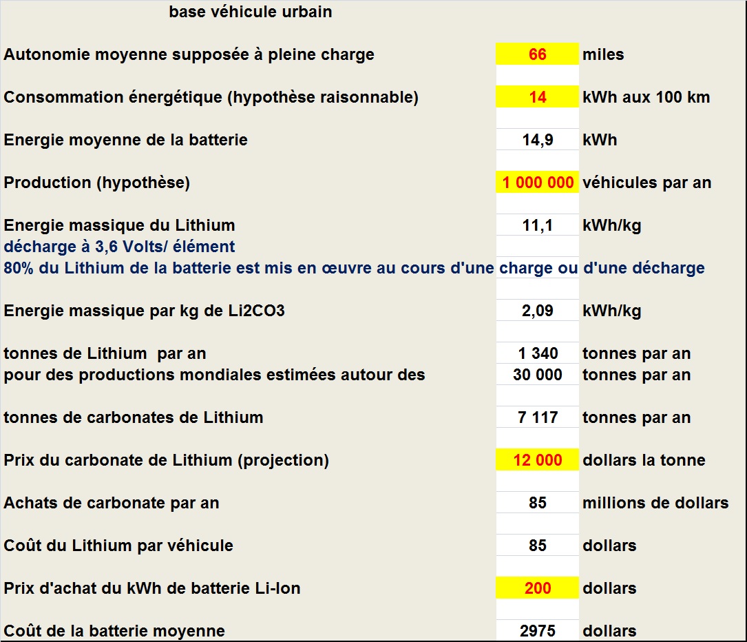 Le calcul conduit à une batterie de 15 kWh pour un prix estimé autour des 3000 dollars et contenant pour 85 dollars de Lithium acheté sous forme de carbonate.