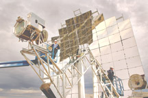 Bruce Osborn, Président Directeur Général de Stirling Energy System, dit avoir signé deux accords avec des électriciens californiens (Southern California Edison et San Diego Gas & Electric) qui concerneraient l’installation au total d’une puissance solaire de 1750 MW produits par 70 000 systèmes Stirling à disques solaires. Chaque unité d’une puissance pouvant atteindre plus de 26 kW, avec un rendement de 31%, est contituée d’un disque réfléchissant de plusieurs dizaines de m2 de surface constitué de 82 miroirs. Au point focal est positionné un capteur thermique qui transmet l’énergie à un moteur Stirling. Le moteur est un système étanche rempli d’Hydrogène. La dilatation de l’Hydrogène dans la partie chaude et sa contraction dans une partie froide assurent la rotation du moteur qui est couplé avec un générateur d’électricité.