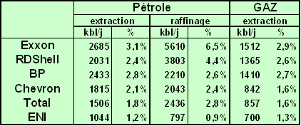 Tout d’abord regardons quels sont les principaux Groupes pétroliers privés et quelles sont leurs parts relatives mondiales d’extraction de pétrole, de raffinage et de production de gaz naturel. Le plus célèbre, Exxon-Mobil ne représente que 3,1% de l’extraction mondiale de pétrole, 6,5% du raffinage et 2,9% de la production de gaz. Il existe plusieurs dizaines d’autres Sociétés que celles mentionnées dans le tableau, dont l’activité repose sur l’extraction de gaz ou de pétrole et/ou le raffinage dont les parts de marché sont bien plus faibles.