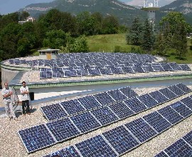 La plus grosse centrale photovoltaïque de France, utilisant l’énergie solaire pour produire de l’électricité, a été inaugurée mercredi 1er juin à Chambéry. Elle est installée sur deux bâtiments dans un site naturel remarquable dominant la cluse de Chambéry. Une première tranche de 860 m² est installée sur des réservoirs d’eau potable, et une deuxième tranche de 150 m² sur un bâtiment proche. La production d’électricité sera environ de 120 000 kWh, et servira en partie à alimenter les pompes des réservoirs (20% environ) le reste sera revendu à EDF dans le cadre de l’obligation d’achat. Les recettes de la centrale (12.000 euros par an) seront affectées à de nouveaux projets de développement. L’installation sera aménagée pour permettre de réaliser des visites et des animations pédagogiques. Le département de la Savoie, déjà le plus solarisé de France,selon M. Dupassieux, adjoint chargé du développement durable, joue à fond la carte de cette énergie nouvelle puisque l’Institut national de l’énergie solaire qui devrait employer bientôt 40 à 60 personnes, en majorité des chercheurs, est en cours d’installation sur le campus universitaire du Bourget-du-lac, a-t-il dit.photo INES