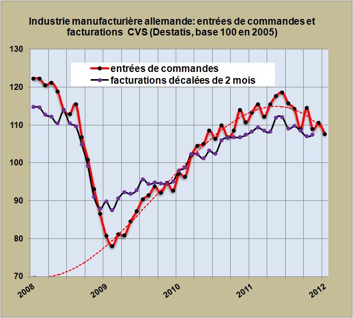 Les cours du Brent après un maximum à 126 dollars atteint à fin Avril 2011 (FIG., courbe rouge) déterminés par la faiblesse du dollar et les événements en Afrique du Nord ont ensuite oscillé autour des 110 dollars jusqu’au début 2012. Depuis sous la menace d’une intervention israélienne musclée en Iran et donc probablement en Syrie et au Liban, on assiste à un essor des cours du pétrole qui se dirigent vers les 100 euros le baril de Brent.