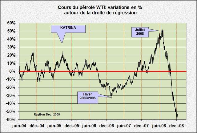 L’Arabie Saoudite, la seule à avoir le pouvoir de régulation des cours au monde, propose un prix plancher à 75 dollars le baril, c’est à dire 25% en dessous du prix d’équilibre. Un examen des fluctuations de cours autour de la droite de corrélation montre que cette limite de -25% n’aurait posé que bien peu de problèmes dans les années récentes (FIG. II), sinon une brève alerte en Janvier 2006.