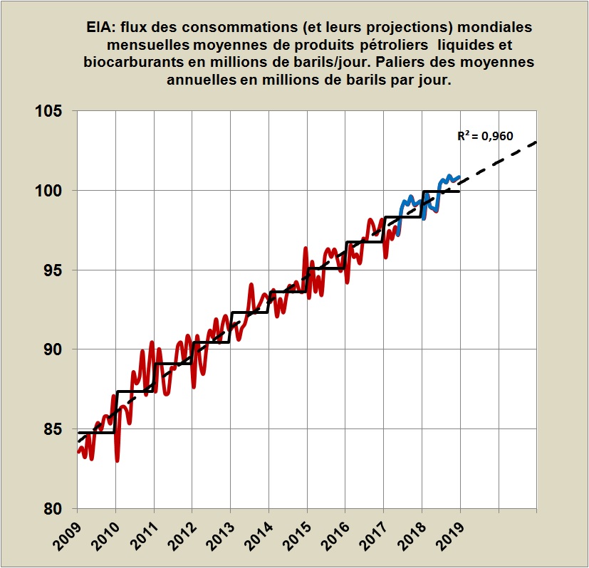 Les publications de l’EIA américaine, portant sur les flux de consommations mondiales de pétrole, nous informent que ces derniers progressent annuellement de 1,5 million de barils par jour. Ils vont atteindre en moyenne les 100 millions de barils par jour en 2018 selon cette loi de progression linéaire (FIG.). Il faudra alimenter le marché d’environ 105 millions de barils par jour dès 2022.