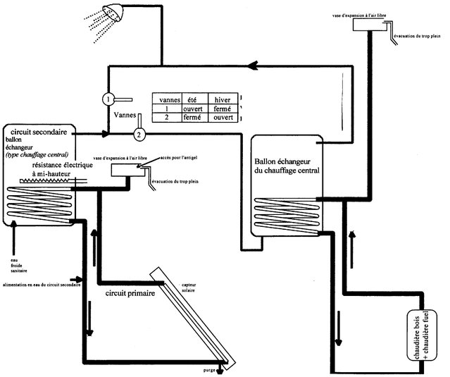 Comme on peut le voir sur le schéma, une double chaudiére solaire/ autre source d’énergie n’est pas d’une conception trés compliqué : du tube, des réservoirs soit 95 % de technologie remontant au 16°siécle…