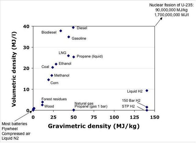 Vient par la suite l’ensemble des énergies peu ou non carbo-polluantes avec seulement 17% du marché. C’est l’hydroélectricité (6%), en plein développement en Amérique du Sud avec 28% de part de marché, qui tient la tête de ce deuxième peloton, puis vient le nucléaire (5,3%) et la biomasse très difficile à évaluer mais estimée autour de 5% du marché. Le développement de la biomasse se heurte tout bêtement à des problèmes de logistique pour collecter un produit de très faible énergie massique et volumique (FIG.II). Elle n’est concevable que pour de petites unités agricoles ou municipales, proches des lieux de culture ou de collecte du bois. Les grands projets complexes et rentables sont difficiles à imaginer, leur approvisionnement en matière première limitant la taille du projet et donc disqualifiant les procédés trop complexes.