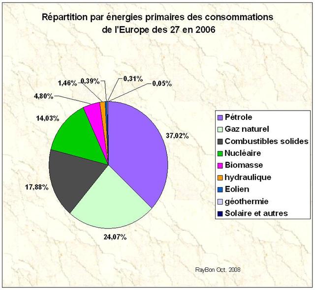 La répartition des consommations en énergies primaires de l’Europe des 27, en 2006, montre que c’est le pétrole avec 37% du marché qui est la principale source d’énergie consommée. Il est clair que c’est le premier poste, au travers de nouvelles offres sur le transport et sur le chauffage industriel, commercial ou domestique, sur lequel l’Europe doit agir. La recherche d’une meilleure efficacité énergétique et l’adoption d’autres sources d’énergies apporteront la solution à la disparition progressive de la ressource pétrolière durant le 21ème siècle. Elle sera fortement encouragée par la montée des prix des ressources d’énergies liquides, nous en avons eu un aperçu cet été.