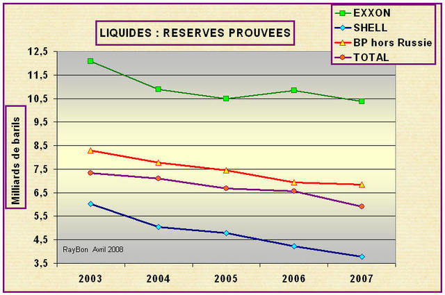 L’examen des réserves prouvées de liquides (pétrole + condensats de gaz) des Sociétés Exxon-Mobil, BP (hors TNK-BP dont les réserves appartiennent au bon vouloir du Kremlin), Total et Royal Dutch-Shell (Fig.) montre la décroissances de ces réserves au cours des cinq dernières années. Il faut tout de suite mentionner que la nationalisation des huiles lourdes de l’Orénoque au Venezuela a fait perdre 500 millions de barils environ à Exxon et à Total ce qui explique l’accentuation de la pente entre 2006 et 2007 pour ces deux Sociétés.