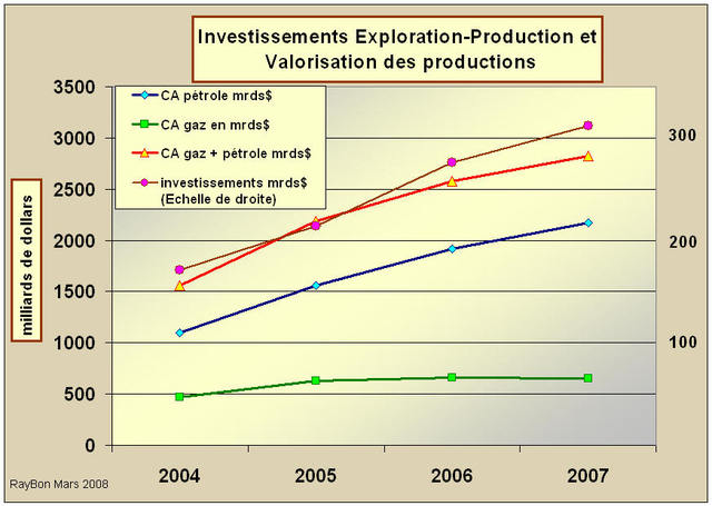 D’après l’IFP dont le sérieux des analyses est bien connu, les dépenses mondiales annuelles en 2007, en Exploration et Production (E&P) ont atteint 312 milliards d’euros en croissance de 82% en trois ans (FIG.). En 2008 ces investissements sont prévus en croissance moins forte, à hauteur de 340 à 350 milliards de $, soit un doublement en 4 ans. Cette croissance est partiellement due à l’inflation des coûts, à la rareté des compétences, mais elle est surtout imputable à la montée en puissance des recherches et des mises en production, en particulier dans le secteur offshore. (voir le rapport IFP)