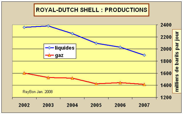 Les productions de Royal-Dutch Shell en 2007 auront confirmé la tendance depuis quatre ans de décroissance annuelle des productions de liquides ( pétrole+ condensats+ sables bitumineux) de 120 mille barils par jour et de quasi stabilité des productions de gaz en deux ans.