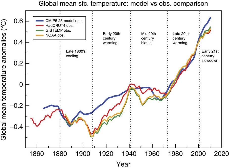 Le débat entre ces deux écoles de pensée, dont aucune n’est objectivement réfutable, peut se résumer simplement à la question pertinente suivante: quelles sont les parts respectives de l’une et de l’autre de ces théories qui peuvent expliquer le réchauffement de la planète mesuré et qui est de l’ordre d’un degré Celsius depuis 1914?