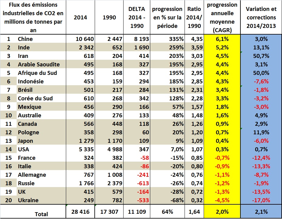 Quelques chiffres simples et scientifiques sont donnés dans la seule table de ce papier. Ce sont les résultats de analyses en CO2 atmosphérique réalisées par les équipes américaines à Mauna Loa et celles réalisées par les équipes japonaises dans l’Antarctique sur la base de Syowa. La moyenne de ces données conduit à une bonne estimation des teneurs atmosphériques en CO2 dans le monde. Entre Janvier 1986 et Janvier 2016, soit sur une période de trente ans de fortes émissions mondiales débridées en gaz carbonique d’origine industrielle et agricole, les teneurs en CO2 atmosphérique ne se sont accrues que de 16% environ, ce qui correspond à une croissance annuelle moyenne de 0,48%.