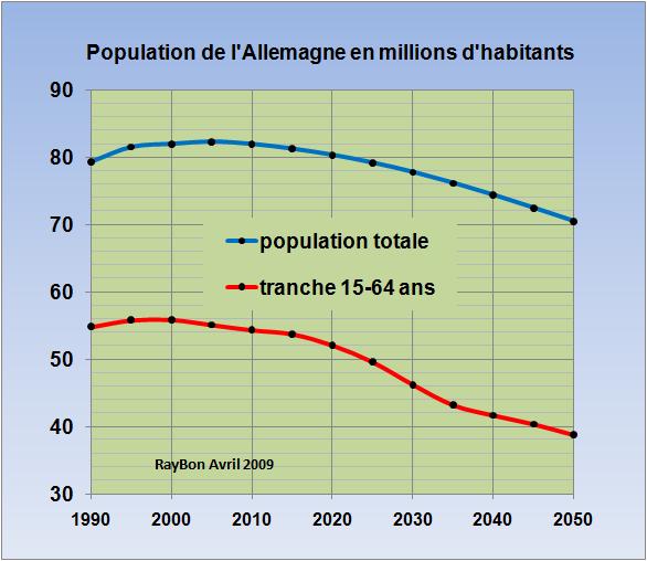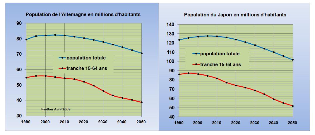Il est fortement probable que ce comportement japonais va se généraliser à d'autres pays européens qui vont aussi voir leur population vieillir et évoluer vers une sagesse respectueuse de l'environnement par attitude philosophique et par nécessité financière. Le profil de projection de la population allemande par exemple, dont la population active décroit depuis les années 2000, est proche de celui du Japon (FIG.V) avec un décalage de 5 ou 10 ans. La population active allemande pourrait baisser de 15 millions d'individus entre 2000 et 2050.