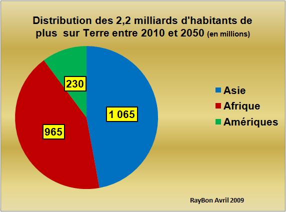 Sur ce point, les Nations Unies nous informent que la croissance démographique dans les 40 ans qui viennent (2010-2050) va représenter probablement 2,2 milliards d'individus. Mais ces 2,2 milliards vont être répartis de façon très inhomogène (FIG.III), l'Asie et l'Afrique croissant chacune d'un milliard d'individus, les Amériques voyant augmenter leurs effectifs de 230 millions, dont 97 millions pour le continent Nord-américain. A l'inverse la population du grand ensemble Europe-Russie perdra 42 millions d'habitants durant cette période. En résumé la population des pays pauvres qui consomment peu d'énergie va augmenter d'ici à 2050 et celle des pays riches consommant beaucoup d'énergie va au mieux rester constante ou décroître (les données seront précisées plus loin).
