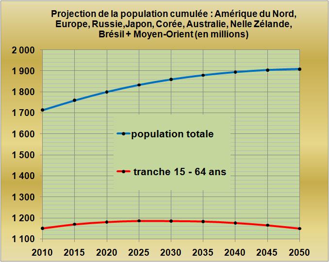 Un examen de l'évolution de population des pays potentiellement les plus riches du monde qui englobe l'Amérique du Nord, l'Europe-Russie, le Japon, la Corée du Sud, l'Australie-Nouvelle Zélande, le Brésil et le Moyen-Orient montre que la population de cet ensemble va croître de 200 millions d'individus entre 2010 et 2050 (FIG.VI). Cependant la population active va demeurer globalement constante en dessous de 1,2 milliards d'habitants.