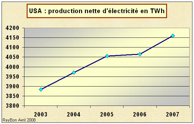 La production nette d’électricité des Etats Unis en 2007 s’est accrue en un an de 2,3% à 4160 TWh, nous informe l’Energy Information Administration. C’est sept fois environ la production de la France.