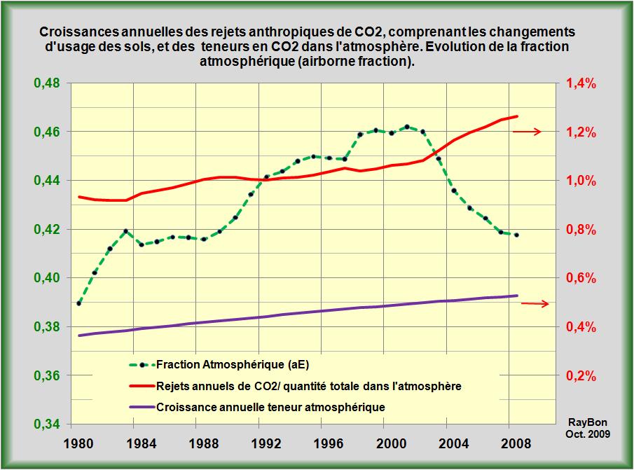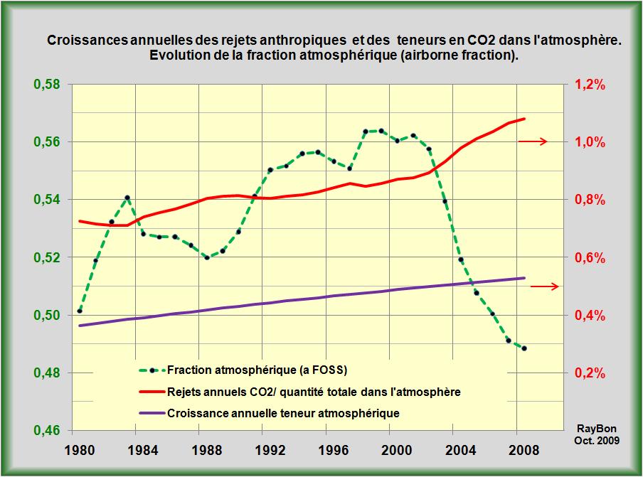 Entre 1993 et 2002 la fraction atmosphérique (aFOSS) du CO2 émis par les activités humaines mesurables (combustion des énergies fossiles et production de ciment) était de l'ordre de 55 à 56%. A partir de 2003 cette proportion s'est mise à décroître pour atteindre 49% du CO2 émis en 2008 (FIG.I, gros points noirs). Sept points de variation de ce ratio, pour 33 milliards de tonnes de CO2 émises annuellement, cela représente annuellement dans les deux milliards de tonnes de CO2 absorbés en plus ou relargués en moins par les terres ou les mers.