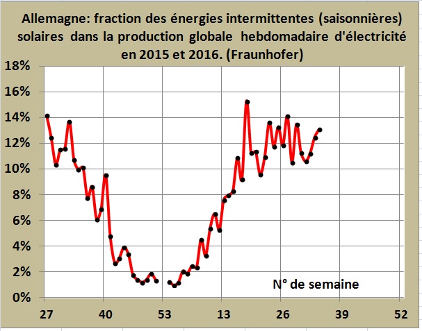 Il ressort de ce simple examen que l’investissement allemand dans le solaire durant la décennie passée, alors que les besoins en énergie stagnaient, a été, pour ce pays et donc pour l’Europe, un pur gâchis économique conduisant à des générations aléatoires et saisonnières d’énergie électrique.